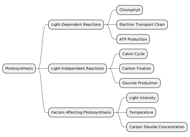 - Primary Branches: The primary branches are “Light-Dependent Reactions,” “Light-Independent Reactions,” and “Factors Affecting Photosynthesis.”