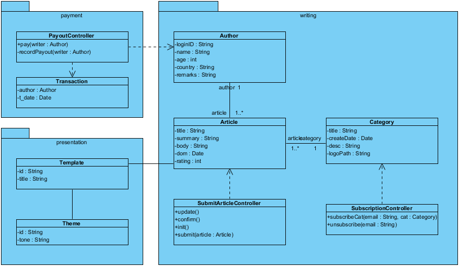 | Association | Between Author and Article (1 to 1..*), and Article and Category. |