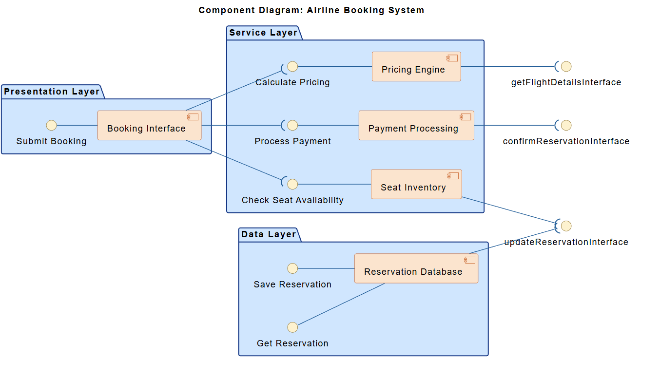 „Erstellen Sie ein Komponentendiagramm für ein Flugbuchungssystem, das Folgendes enthält: Buchungsschnittstelle, Sitzbestand, Preiskalkulations-Engine, Zahlungsabwicklung und Reservierungsdatenbank.“
