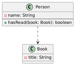 निर्भरता डैश्ड लाइन + तीर “उपयोग करता है” व्यक्ति → पुस्तक