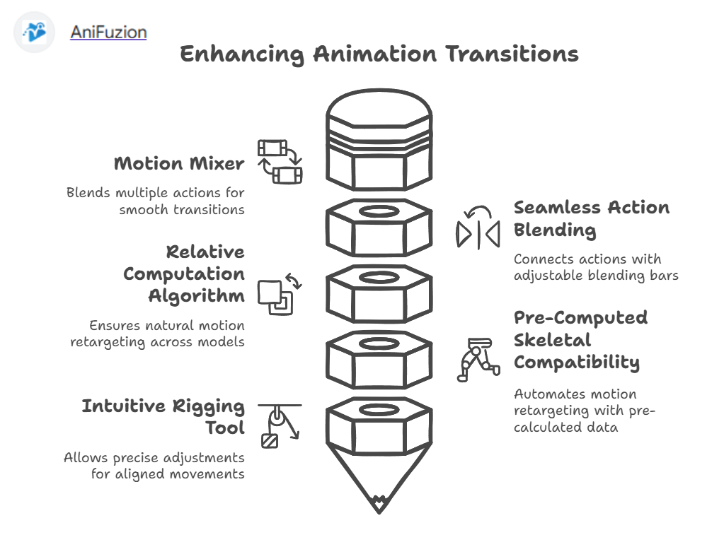 アニメーションにおいて、滑らかな遷移は視聴者の没入感を維持し、洗練された体験を提供するために不可欠です。急な変化や不自然な動きは物語の流れを乱し、関与度を低下させ、プロフェッショナリズムを損なう可能性があります。AniFuzionは、動作を滑らかに融合させ、モーションを正確にリターゲットし、ポーズを精密に修正できるツール群を提供することで、マーケティング、教育、ゲームなど、さまざまな分野のクリエイターにとって理想的な選択肢となっています。