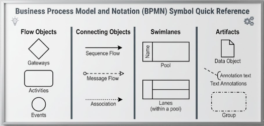 BPMN Comprehensive Guide: A detailed breakdown of flow objects, connecting objects, and data representation.