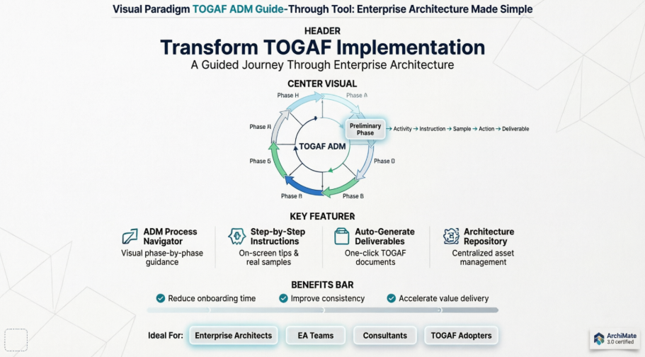 - Visual Paradigm TOGAF ADM Guide-Through Process: Official product page describing the guided TOGAF ADM implementation tool with step-by-step navigation, automated deliverables, and ArchiMate support.